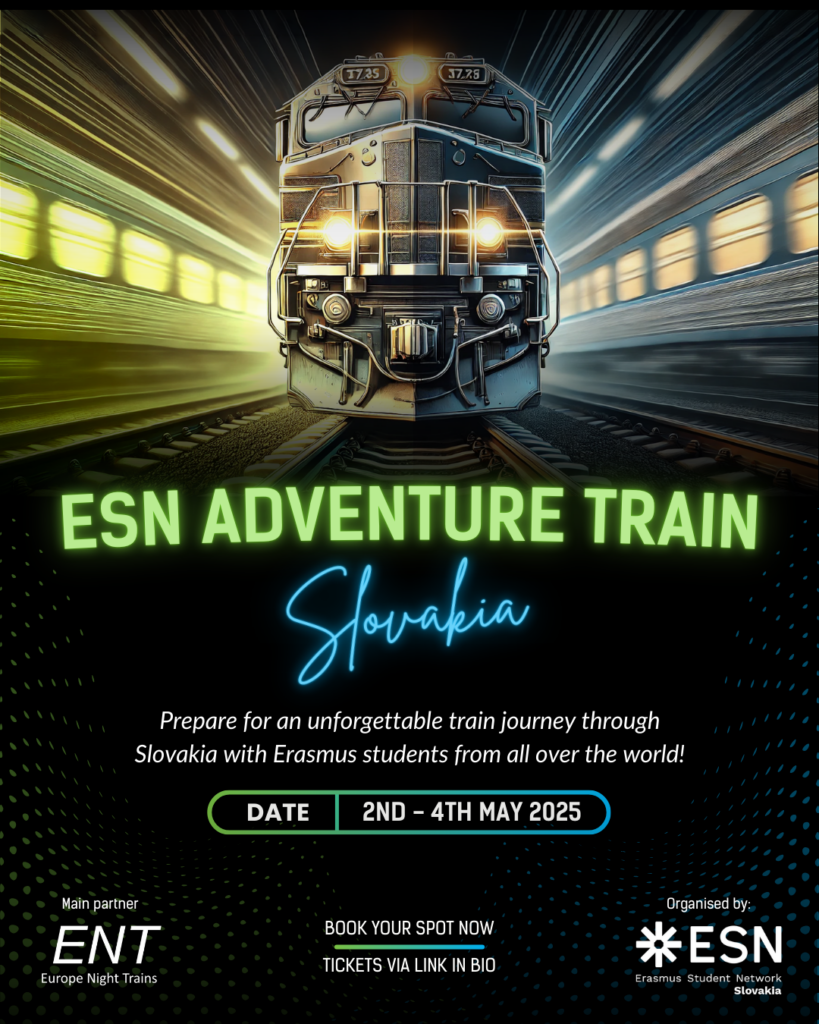V dňoch 2. – 4. mája 2025 sa Slovenskom prehnala vlna energie, nadšenia a kultúrnej výmeny. Prvý ročník dobrodružného vlaku ESN, organizovaný pod záštitou študentskej siete Erasmus Student Network Slovakia a všetkých jej 10 lokálnych sekcií, spojil študentov programu Erasmus+, slovenských nadšencov cestovania a miestnych dobrovoľníkov na jedinečnej jazde súkromným vlakom, ktorá zanechala nezabudnuteľné spomienky vo všetkých účastníkoch. 200 mladých ľudí rôznych národností malo možnosť zažiť túto zaujímavú jazdu na vlastnej koži.